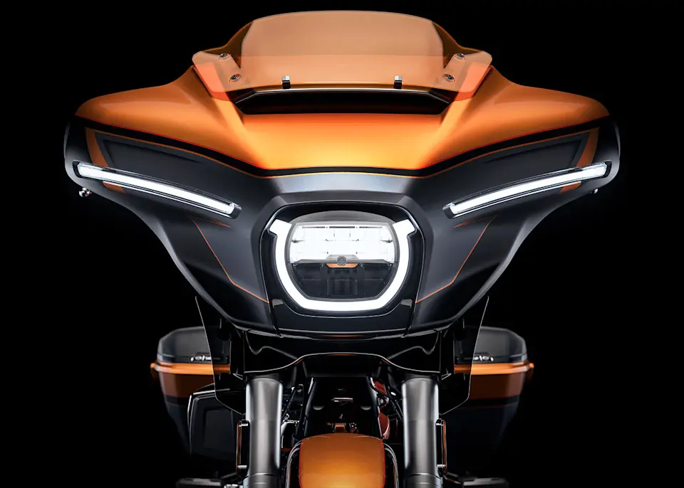 Das bernsteingetönte Windschild fügt eine auffällige visuelle Signatur hinzu. Gleichzeitig verbessert es die Sichtbarkeit und reduziert die Blendung. Das Windschild passt farblich zur Lackierung Torched Orange, sorgt für eine attraktive Frontansicht der CVO Street Glide und fügt dem Ganzen einen Hauch von Wärme und unverkennbarem CVO Charakter hinzu.